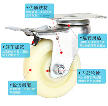 主要分為:塑料腳輪、尼龍腳輪、鋼鐵腳輪、耐高溫酚醛樹(shù)脂腳輪、橡版膠腳輪、PVC腳輪、TPE靜音腳輪等。另外除了主要的腳輪材質(zhì)之外,腳輪材質(zhì)還有鑄鐵鑄鋼、丁腈橡膠腳輪(NBR)、丁腈膠、天然橡膠腳輪、硅氟橡膠腳輪、氯丁橡膠腳輪、丁基橡膠腳輪、...